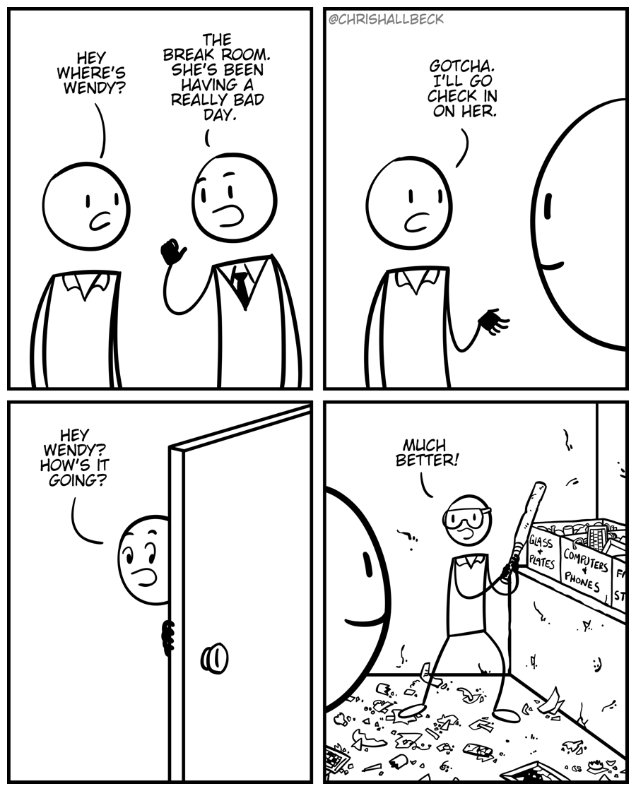 #2124 – Wendy Posted on July 26, 2021 at 12:33 pm by Chris Tags: break, break room, stress, work Leave a Reply Cancel reply Your email address will not be published. Required fields are marked *Comment Name * Email * Website